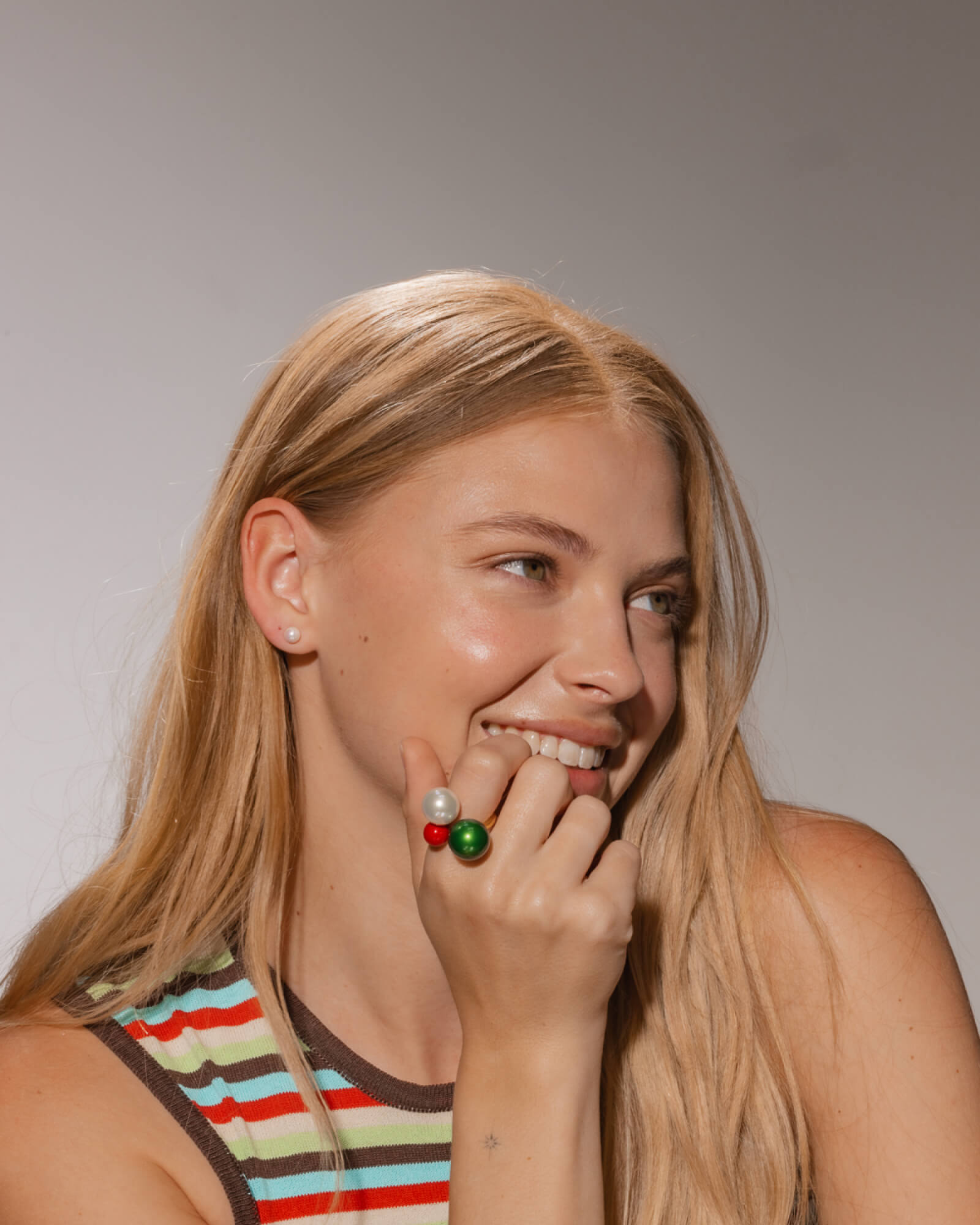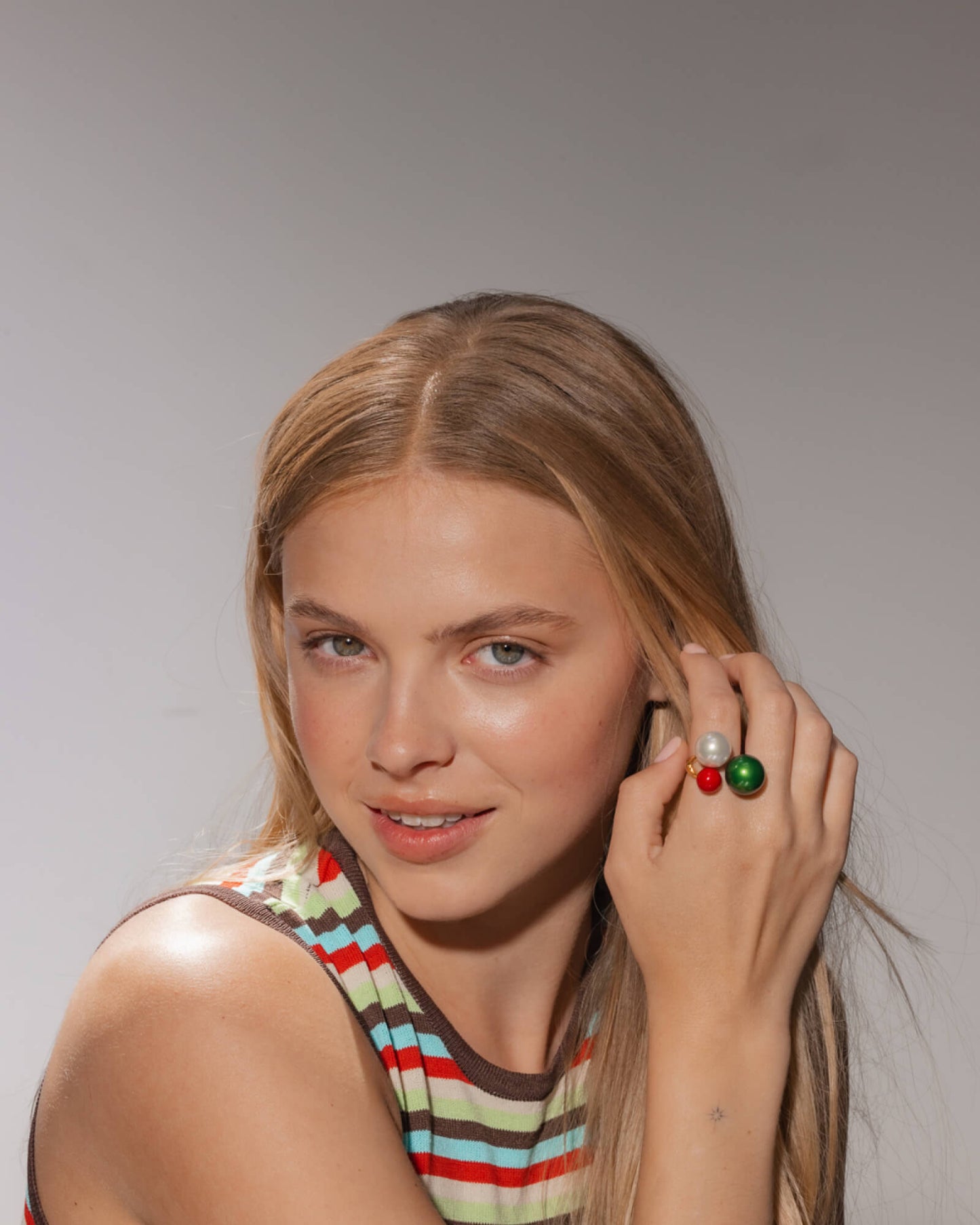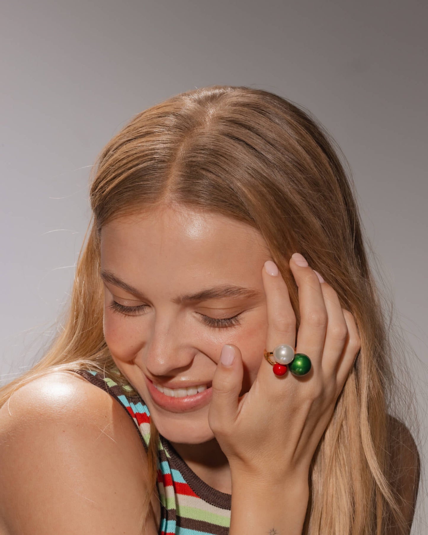 Anillo Triple Perla Blanca, Roja y Verde Twins & Triplets