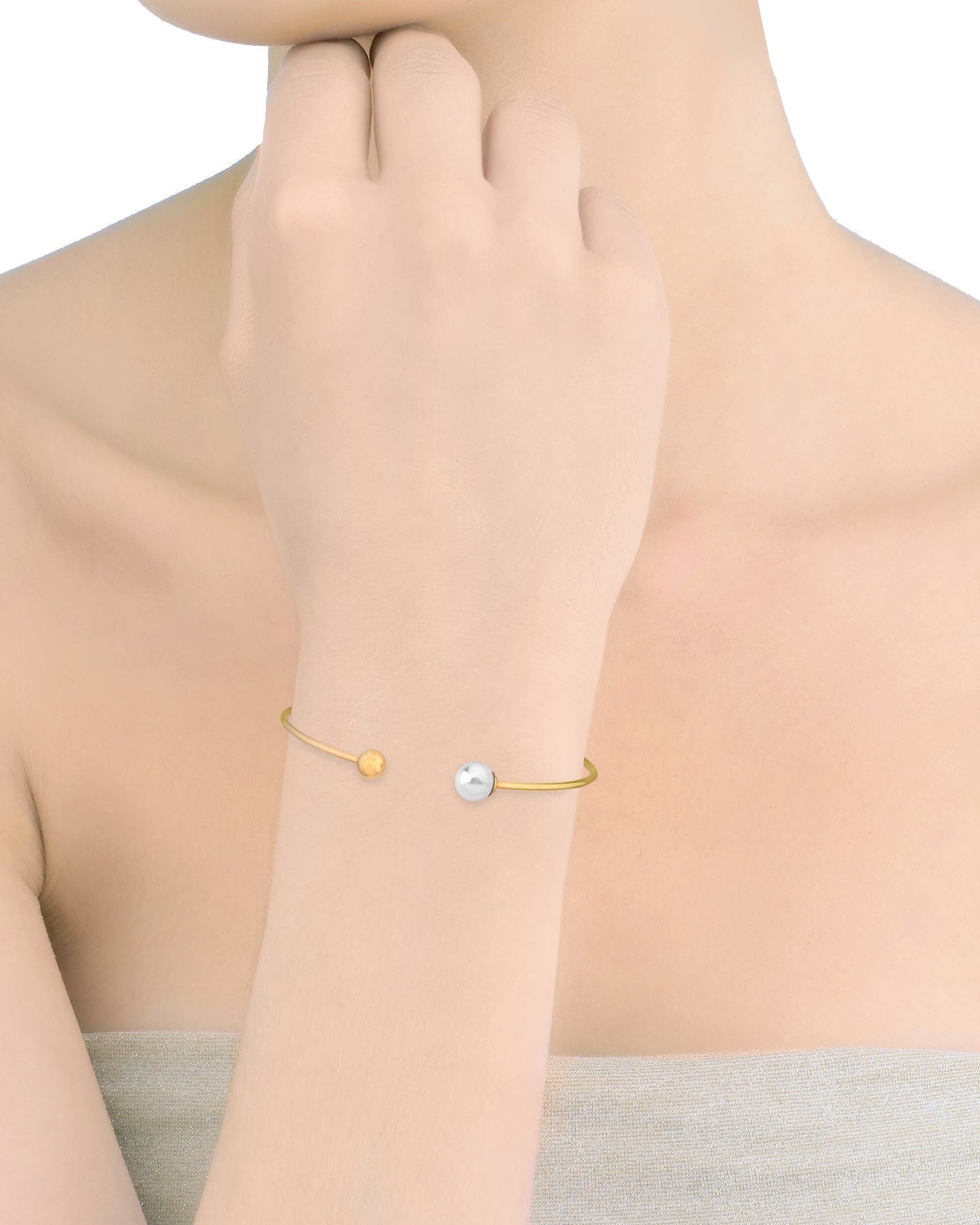 Brazalete rígido 58x58mm en acero dorado, 8mm perla Redonda blanca y bola acero.