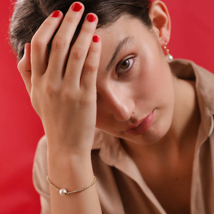 Brazalete en acero dorado, 8mm perla redonda blanca. Su diseño aporta aire fresco y versátil, permitiendo expresar tu estilo personal para cualquier ocasión.