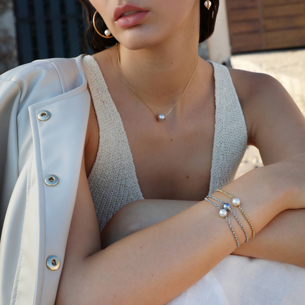 Llevar perlas es más que un simple gesto de estilo; es una declaración de elegancia atemporal. Cada perla encierra en su forma perfecta siglos de historia, sofisticación y refinamiento. Al llevarlas, conectas con una tradición que trasciende generaciones, un símbolo de feminidad, fortaleza y belleza interior. Son el reflejo sutil de tu esencia, realzando tu personalidad con una luz única, como si cada una de ellas contara tu historia personal. Las perlas no solo adornan, te envuelven en su aura de autenticidad y elegancia muy on trend.