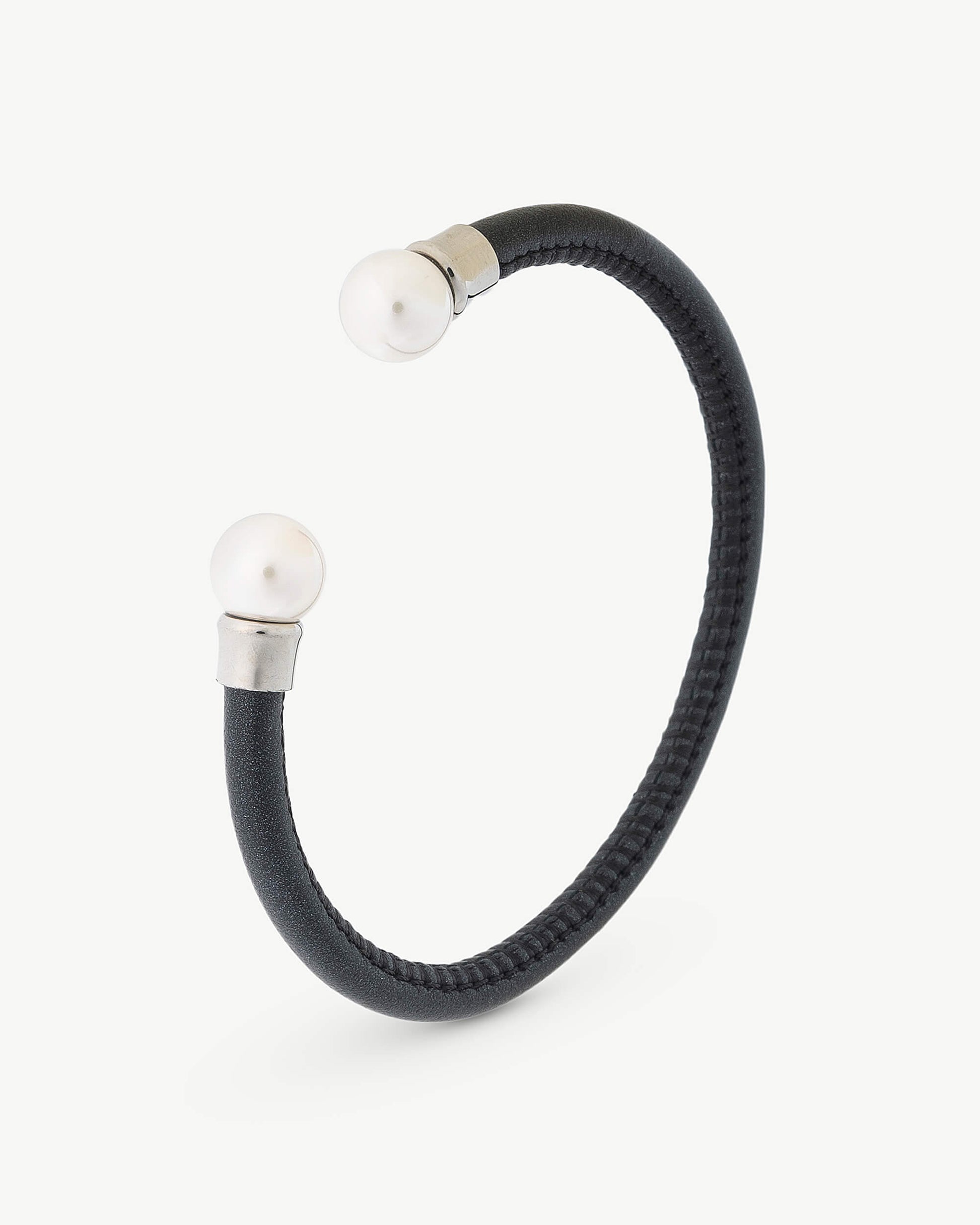 Brazalete rígido con cuero negro de 44cmx53cm en acero, 8mm perlas Redondas blancas.