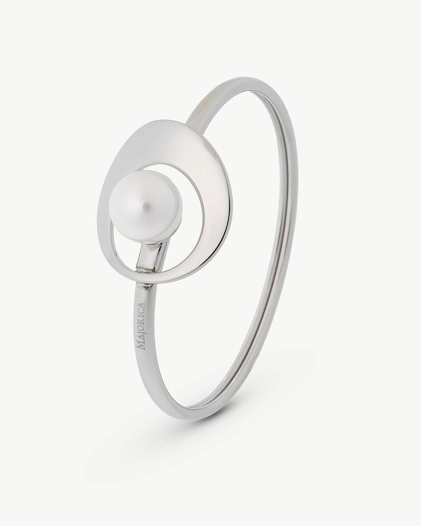Brazalete rígido 46x58m de diámetro en acero, 12mm perla blanca. Petra es el nombre de nuestra colección y de la localidad que ocupa la parte más central de Mallorca, en el más puro corazón de la isla.