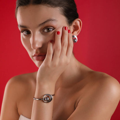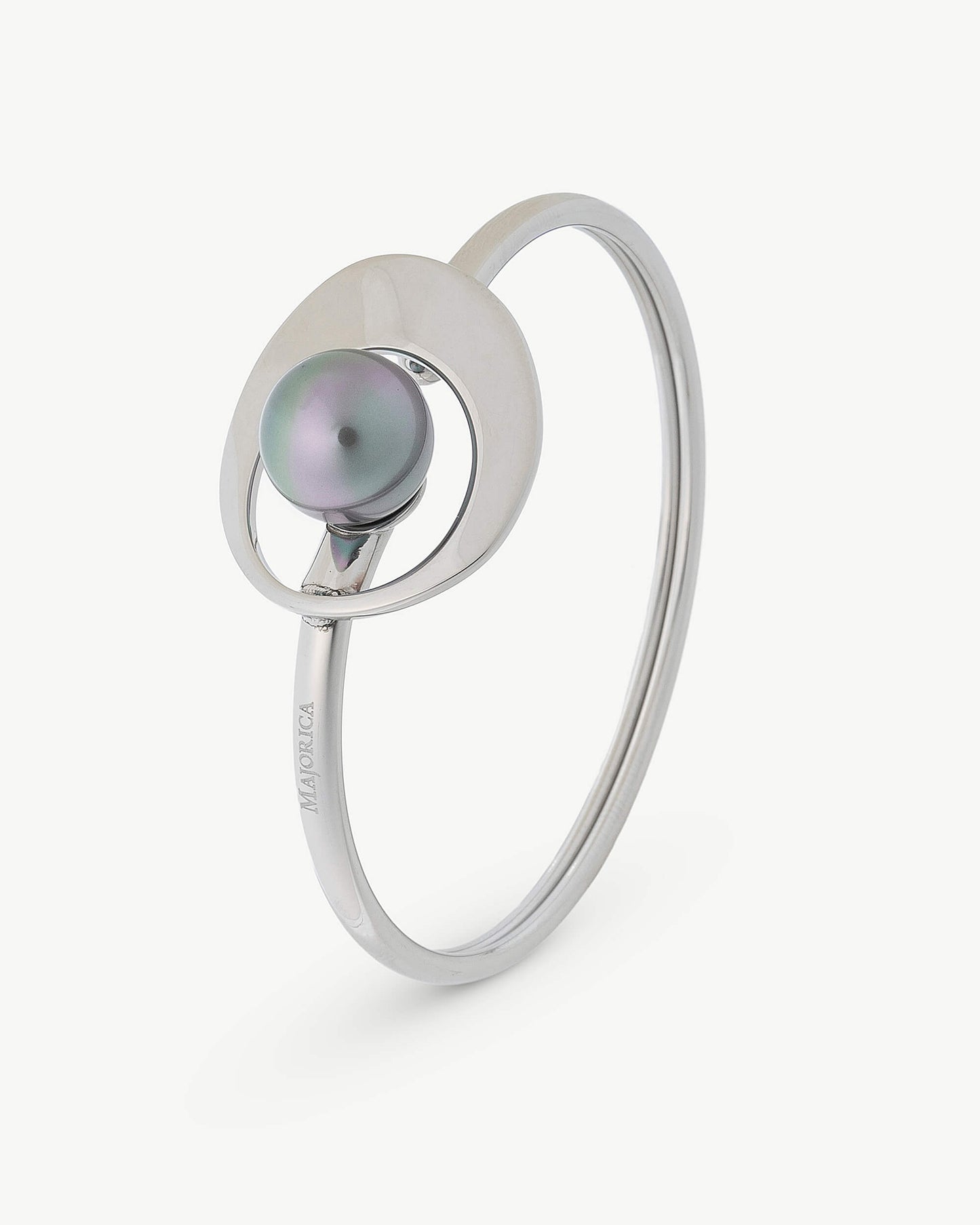 Brazalete rígido 46x58m de diámetro en acero, 12mm perla redonda gris. Petra es el nombre de nuestra colección y de la localidad que ocupa la parte más central de Mallorca, en el más puro corazón de la isla.
