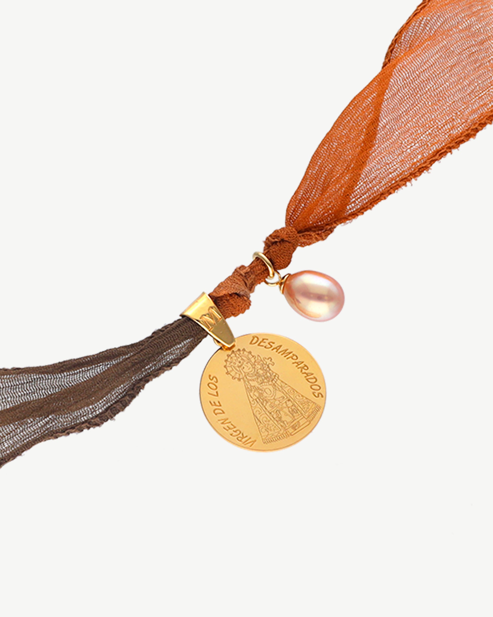 Hecha en cinta de seda multicolor de 85cm de largo, con medalla en plata plata bañada en oro de 18k y perla salmón de 9mm.