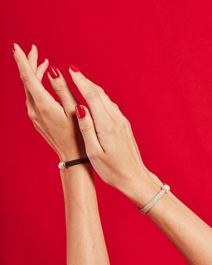 Brazalete elastico ajustable con hilos de plata color azul. Las joyas diseñadas por Majorica para la colección Circa serán tu nuevo amuleto ¡Los materiales cómodos y las formas orgánicas llegan a tus joyas favoritas! Circa es la colección para aquellos que quieren llevar el sello Majorica siempre consigo.