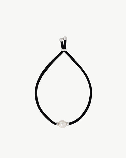 Brazalete elástico de 20 cm ajustable en color negro, perla redonda blanca de 8 mm.. La colección Sifnos es un tributo a la fuerza y empoderamiento.