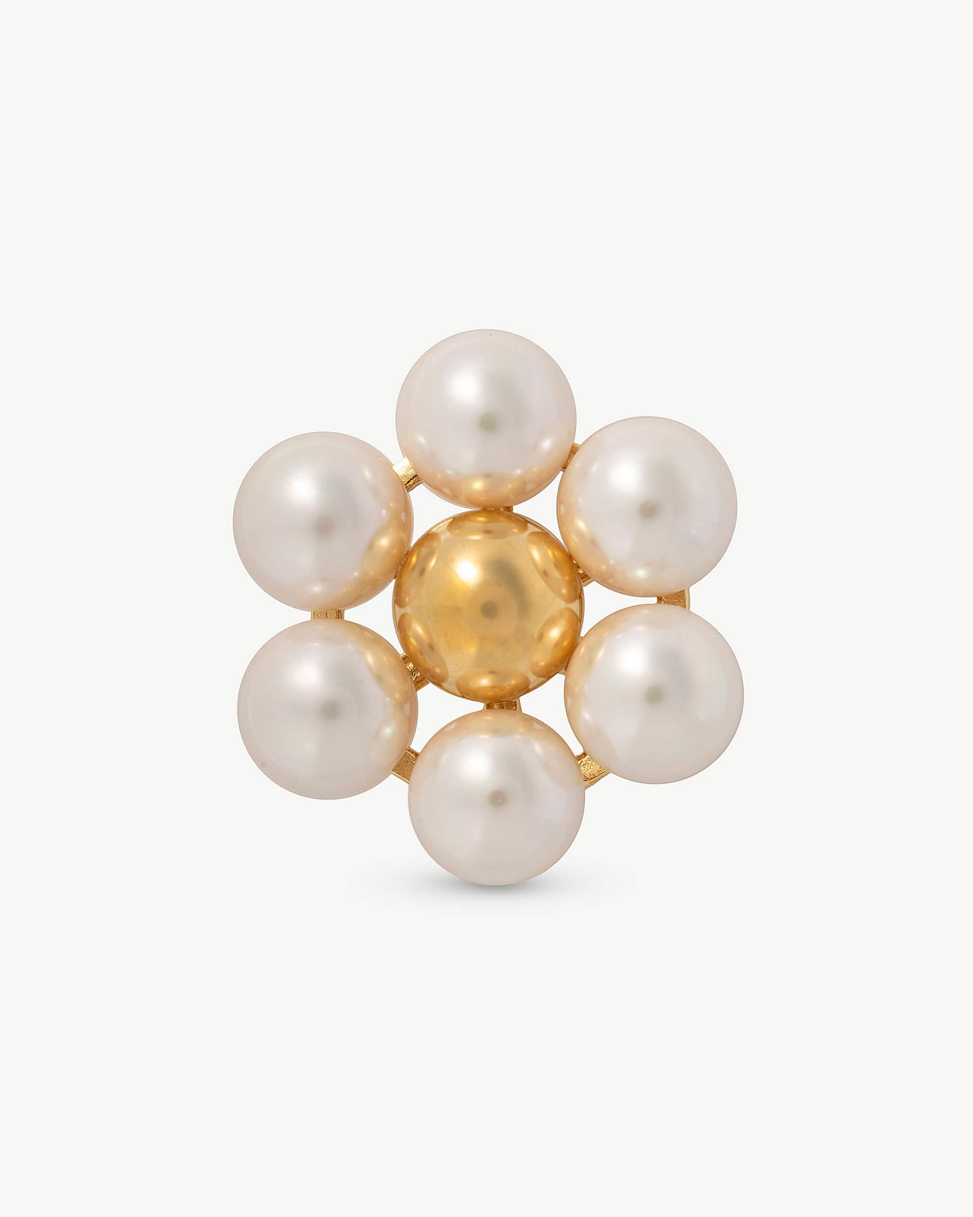 Broche /charm en plata bañada en oro de 18k con perlas blancas de 8 mm y bola metálica dorada. Los broches de Majorica con forma de flor de los años 40 inspiran nuevas colecciones