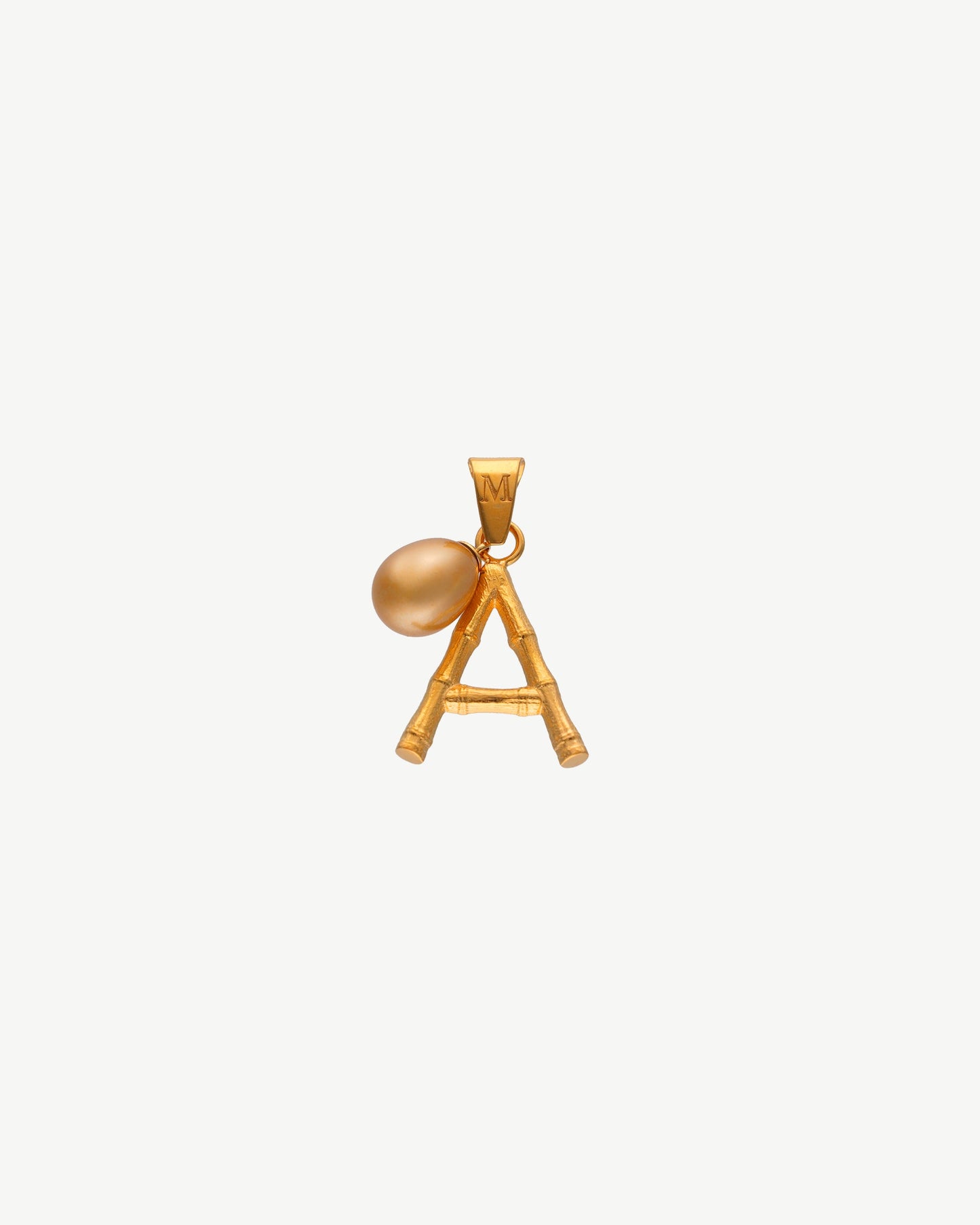 Charm inicial A en plata bañada en oro de 18k con perla champagne. La cápsula Bambú representa la exótica selva, los altos árboles de ramas entrelazadas que forman un espectacular dosel.