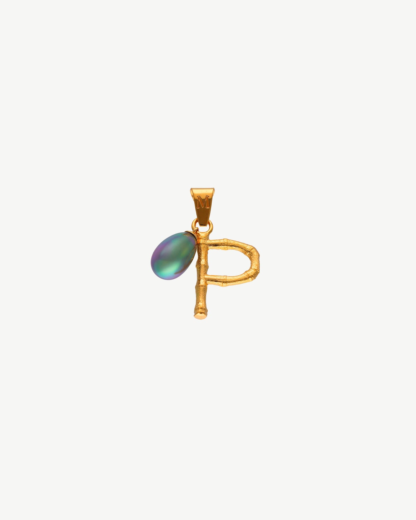Charm inicial P en plata bañada en oro de 18k con perla Gris. La cápsula Bambú representa la exótica selva, los altos árboles de ramas entrelazadas que forman un espectacular dosel.