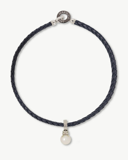 Collar en acero cuero trenzado azul con perla redonda blanca de 14mm. Piezas desenfadadas de gran calidad para los más eclécticos