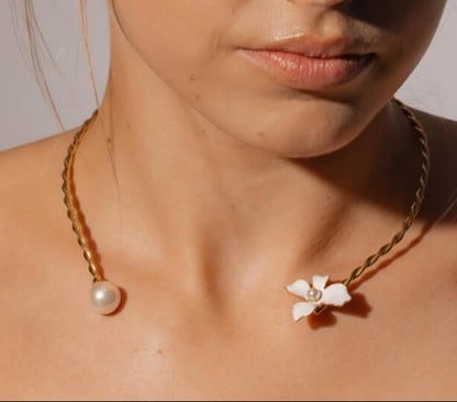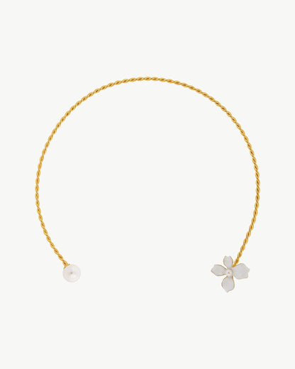 Chocker ajustable en plata bañada en oro de 18k con flor blanca y perlas redondas blancas de 5 y 12 mm. Las flores esmaltadas sobre plata bañada en oro de 18k brillan para ocasiones de día y de noche.