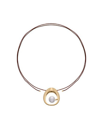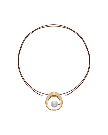 Colgante L en acero dorado con perla redonda blanca redonda de 14mm. Cordon de seda café de 130cm. Petra es el nombre de nuestra colección y de la localidad que ocupa la parte más central de Mallorca, en el más puro corazón de la isla.