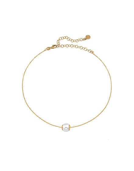 Gargantilla de 33cm., con cadena alargadora de 10 cm en plata bañada en oro de 18k. Con una perla redonda blanda de 10 m.
