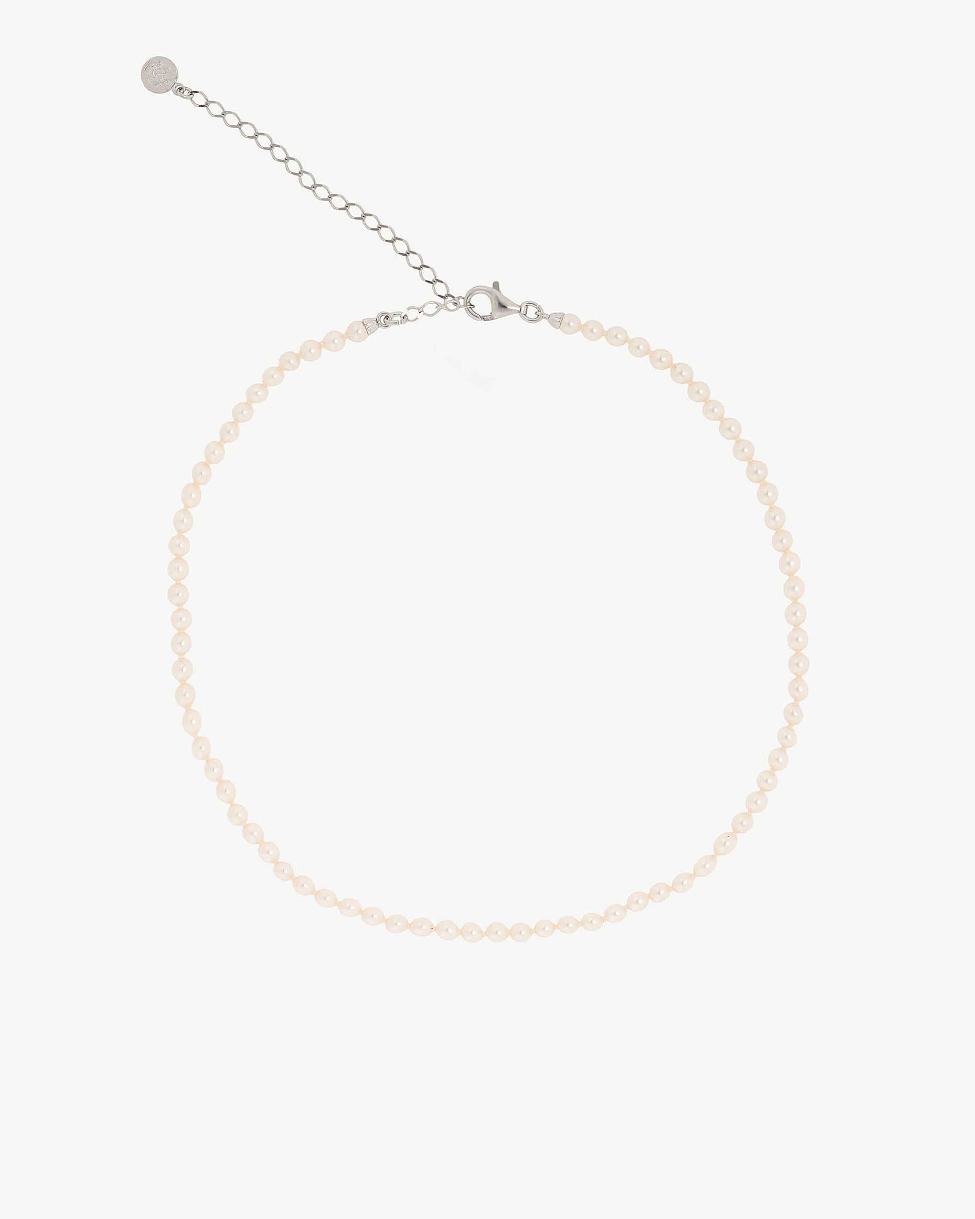 Collar de perlas de 34/40cm en plata, perlas redondas blancas de 4mm. La magia y elegancia propia del ballet clásico se reinventa en esta colección de clásicos atemporales.