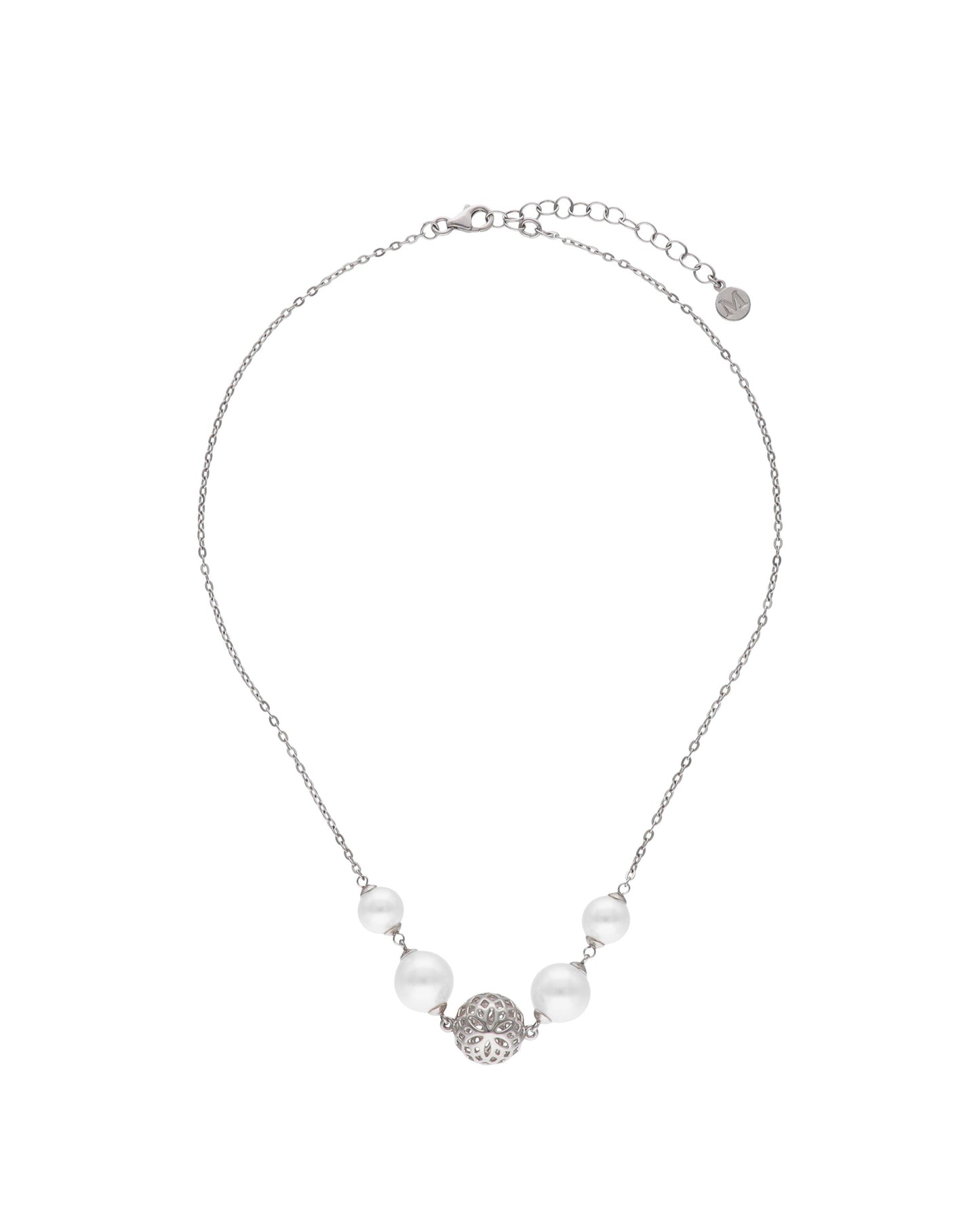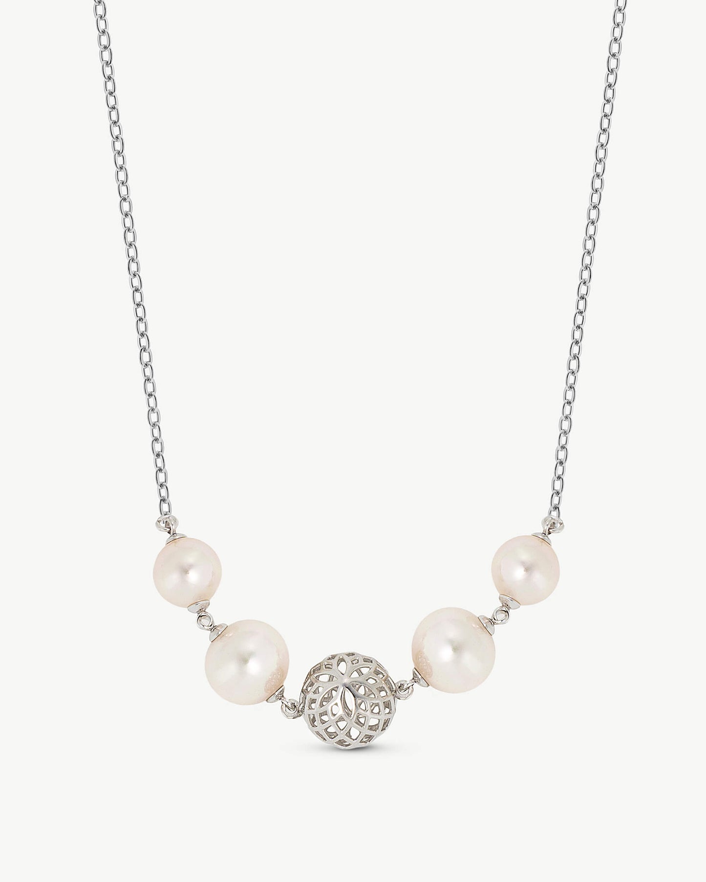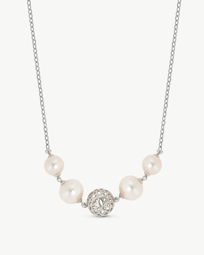 Collar encadenado en plata con perlas de 8 y 10mm y bola calada en plata. Largo de 37cm.. Joyas especiales para momentos especiales.