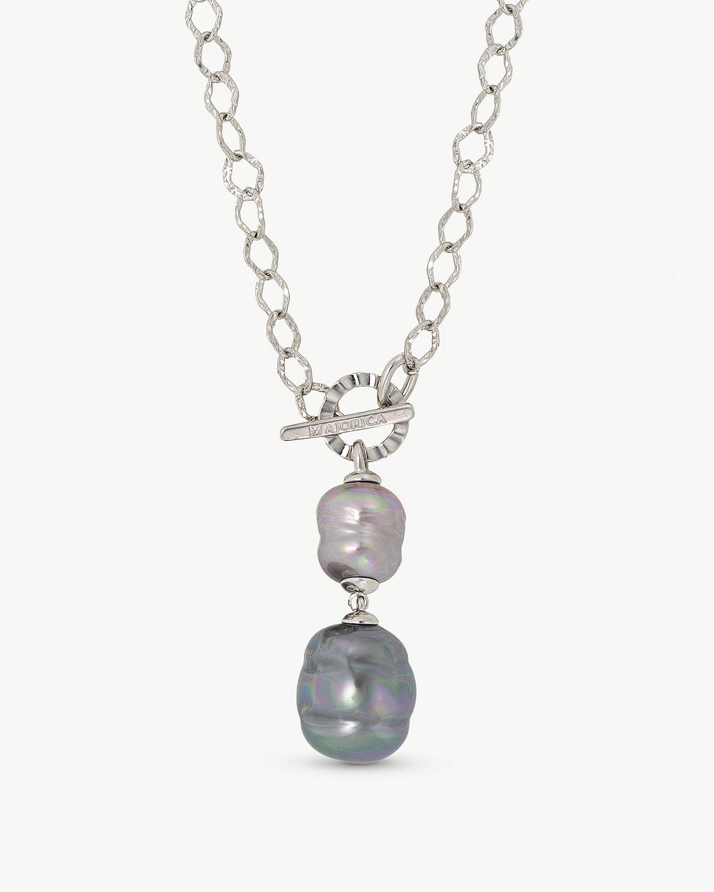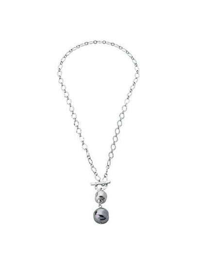 Collar corto encadenado de 48cm en plata, 12/16mm perlas barrocas gris y nuage. Para esta colección de brazaletes, anillos y pendientes, elaborados en acero de alta calidad y adornados con perlas, cada pieza ha sido creada para combinar la sobriedad del acero con la atemporalidad de las perlas.
