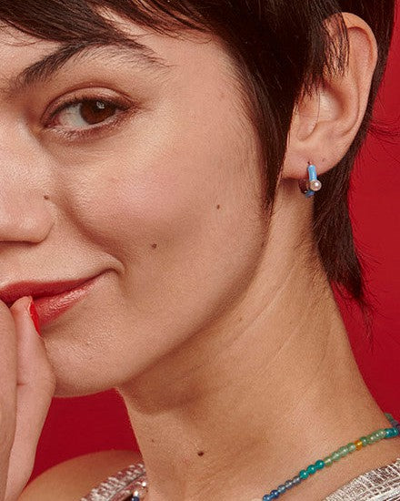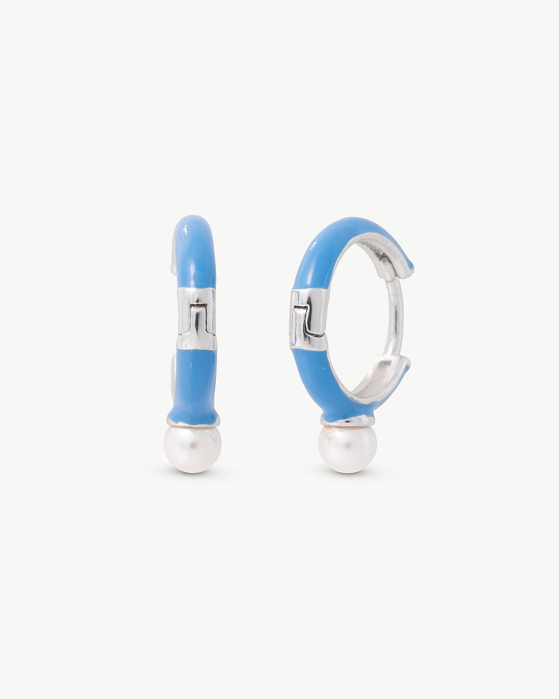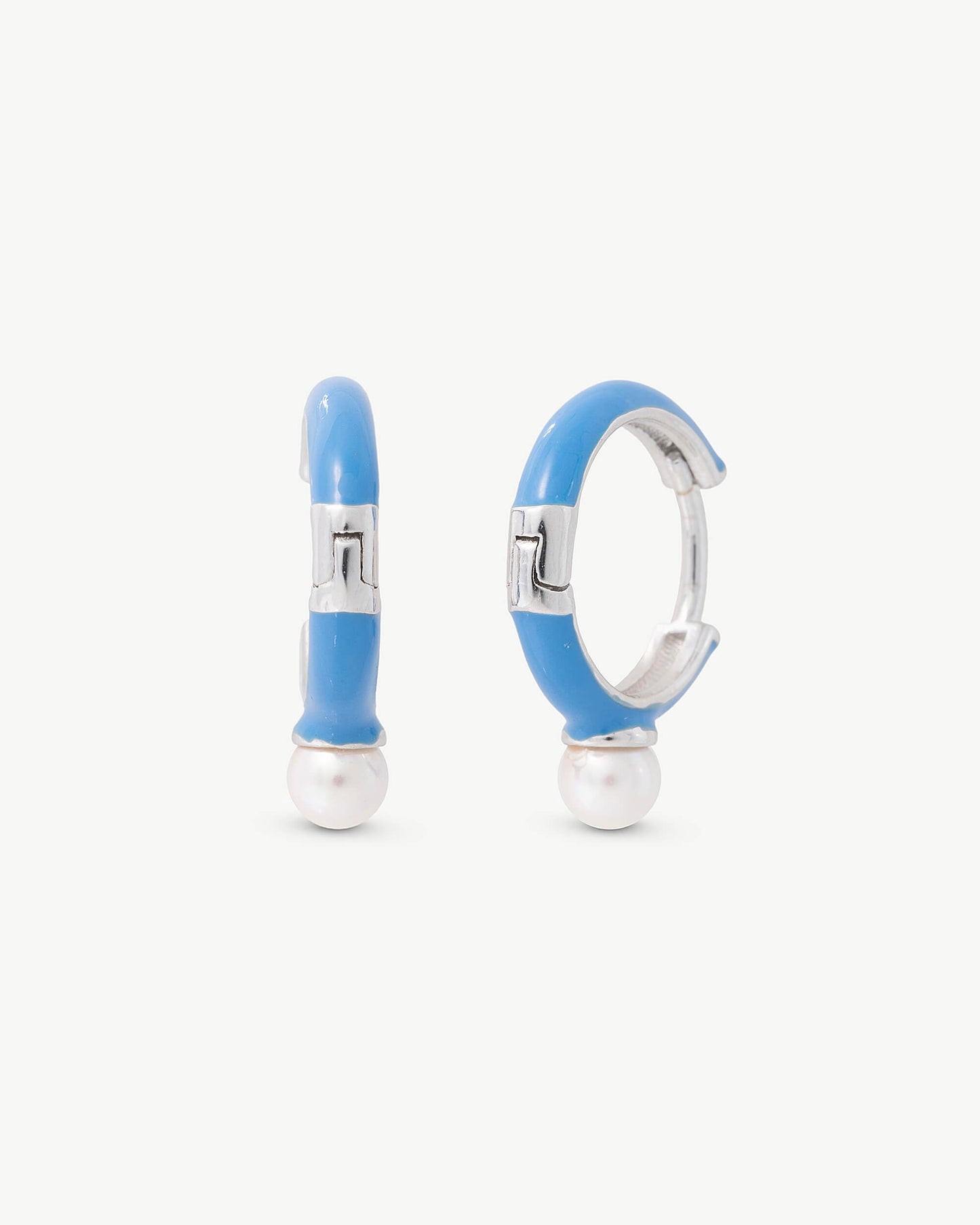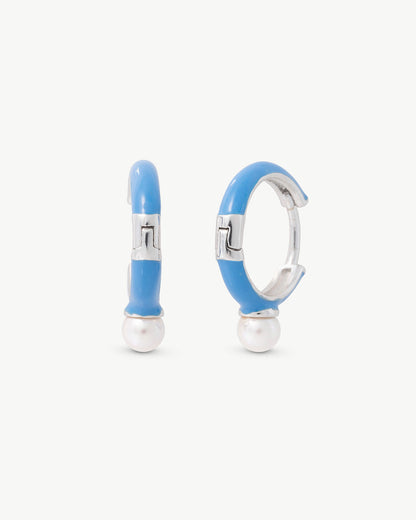 Pendientes de aro mini en plata esmaltado en color azul y perla redonda blanca de 4mm.
