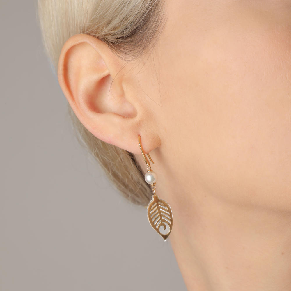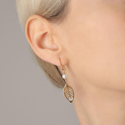 Pendientes Largos Hojas y Perla 4mm Dorados Romea