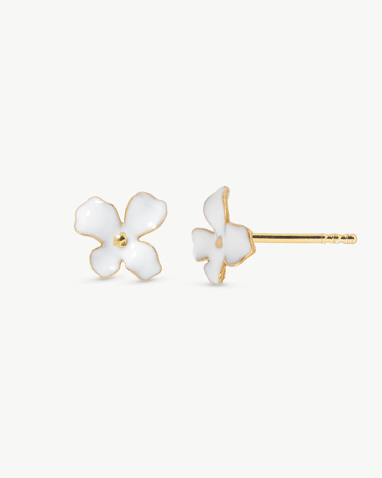 Pendientes de 7mm en plata bañada en oro de 18k con baño de oro de 18k y una flor blanca esmaltada, con cierre de pincho.