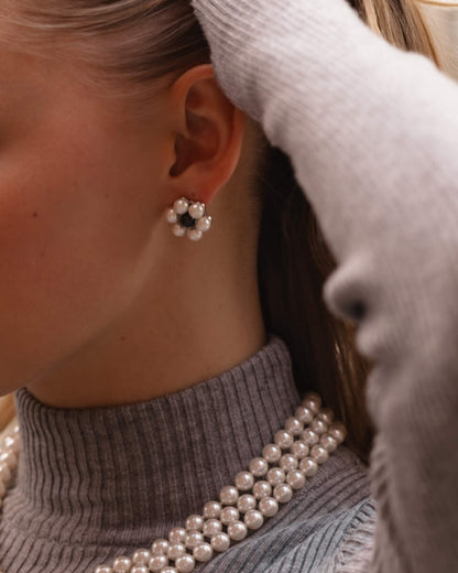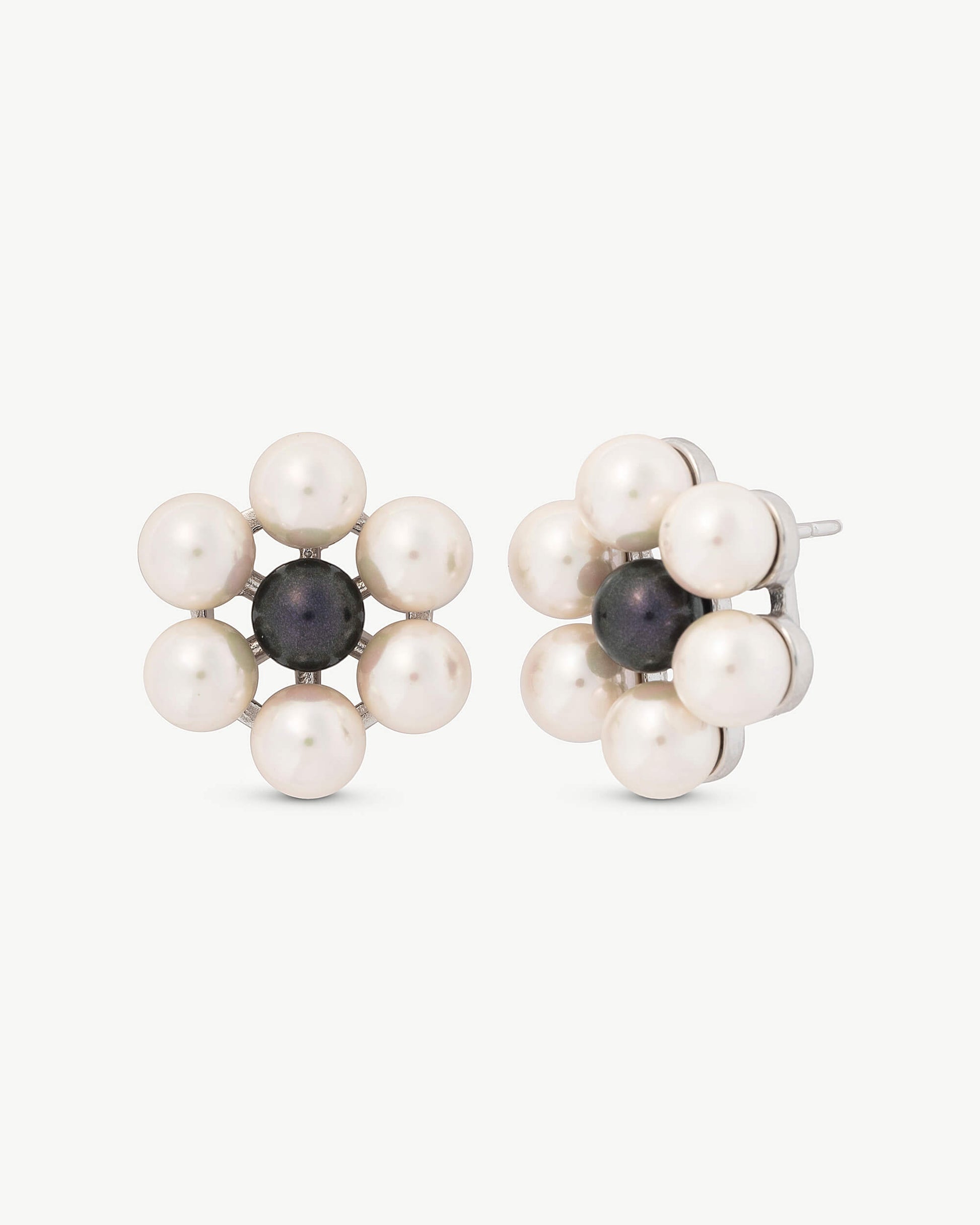 Pendientes de botón en forma de flor con cierre de pincho en plata con perlas negras y blancas de 6 mm redonda.