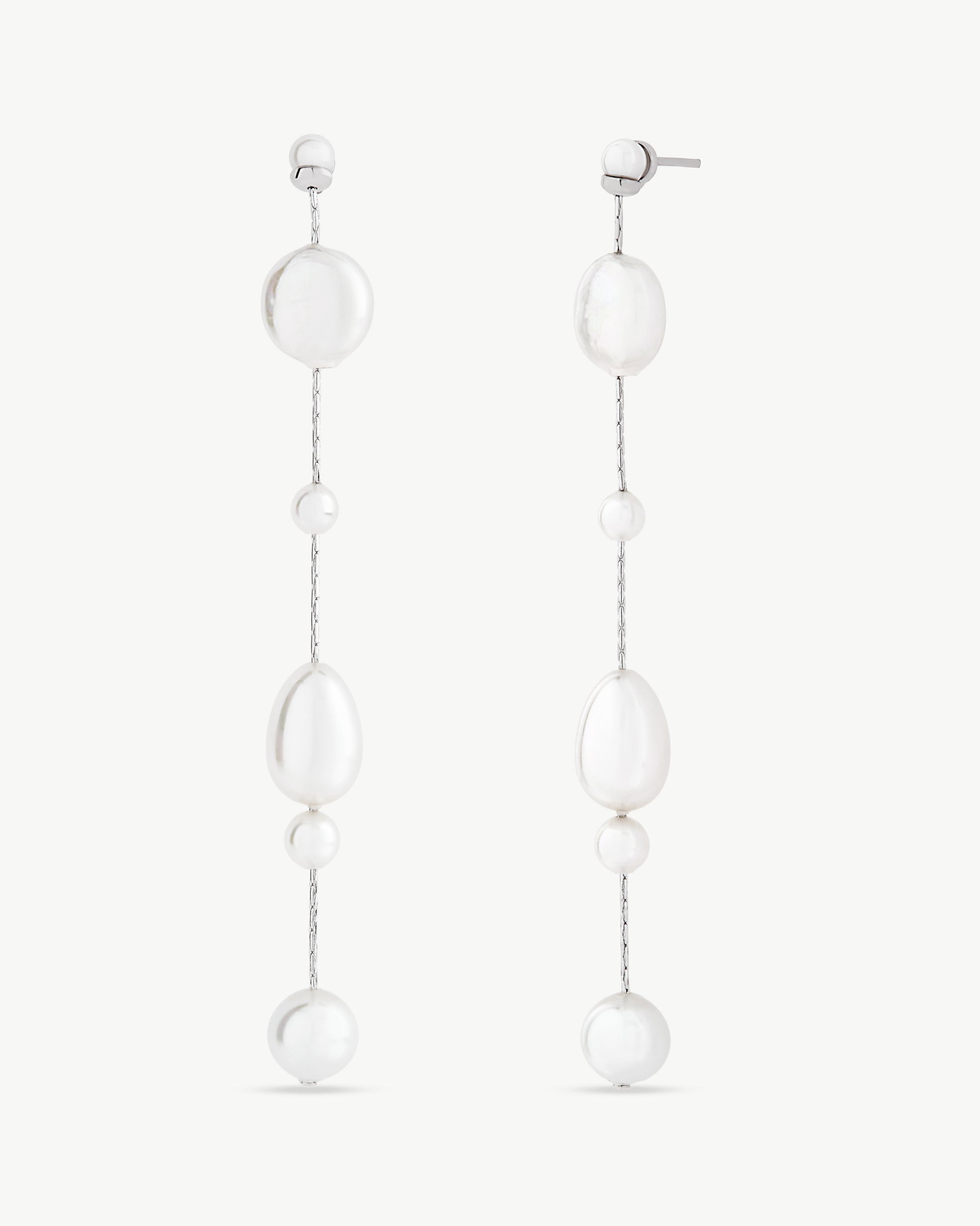 Pendientes largos de 8cm con cierre de pincho. Diseño moderno y actual de perlas y cadena en plata de Ley. Presenta perlas artesanales blancas de diferentes tamaños y formas: de 4,5,8,9 y 10mm redondas, de gota y ovales.