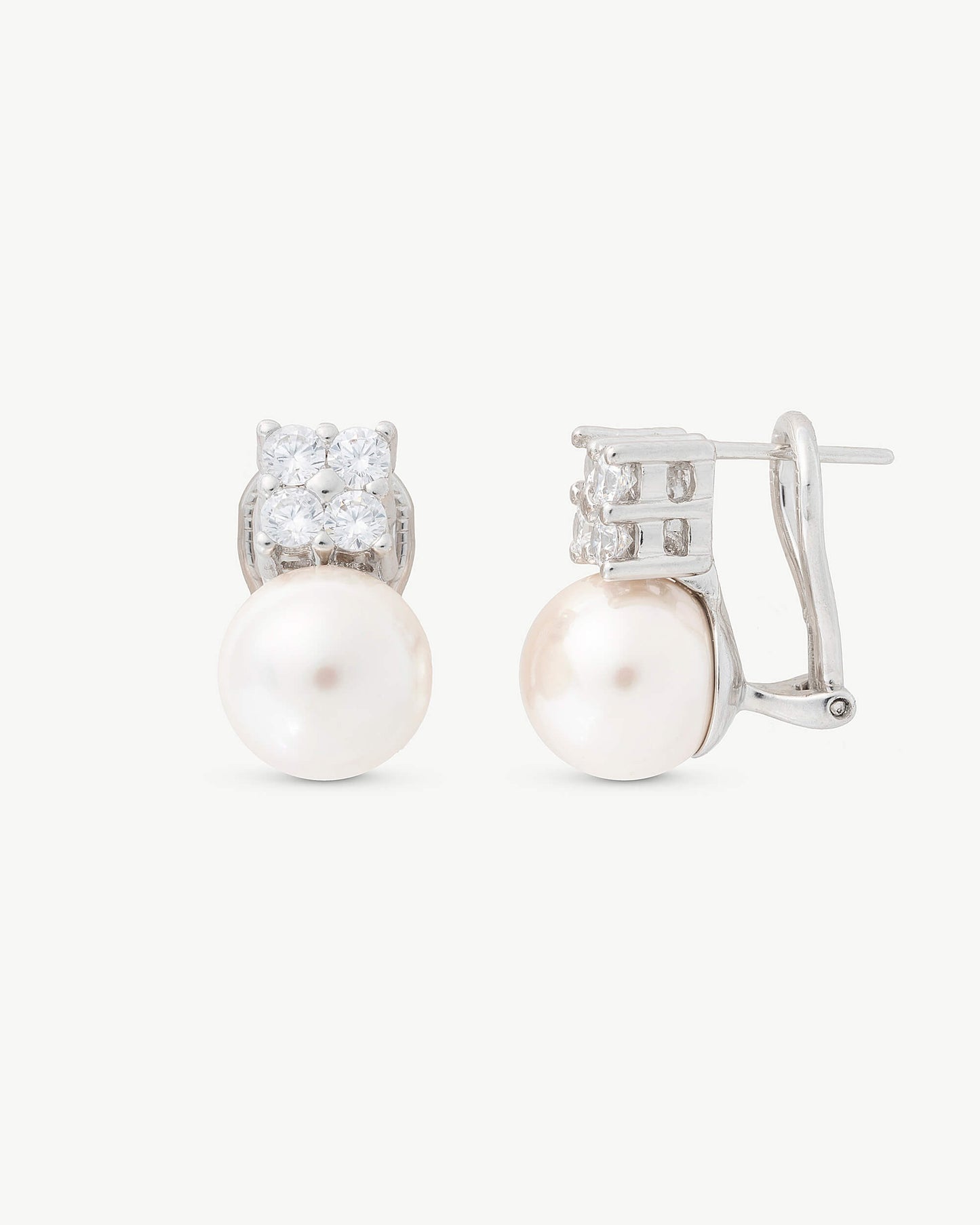 Pendientes con cierre omega con pincho en plata con perlas redondas blancas de 10mm y circonitas. Unos Pendientes Tú y yo para tu día a día.