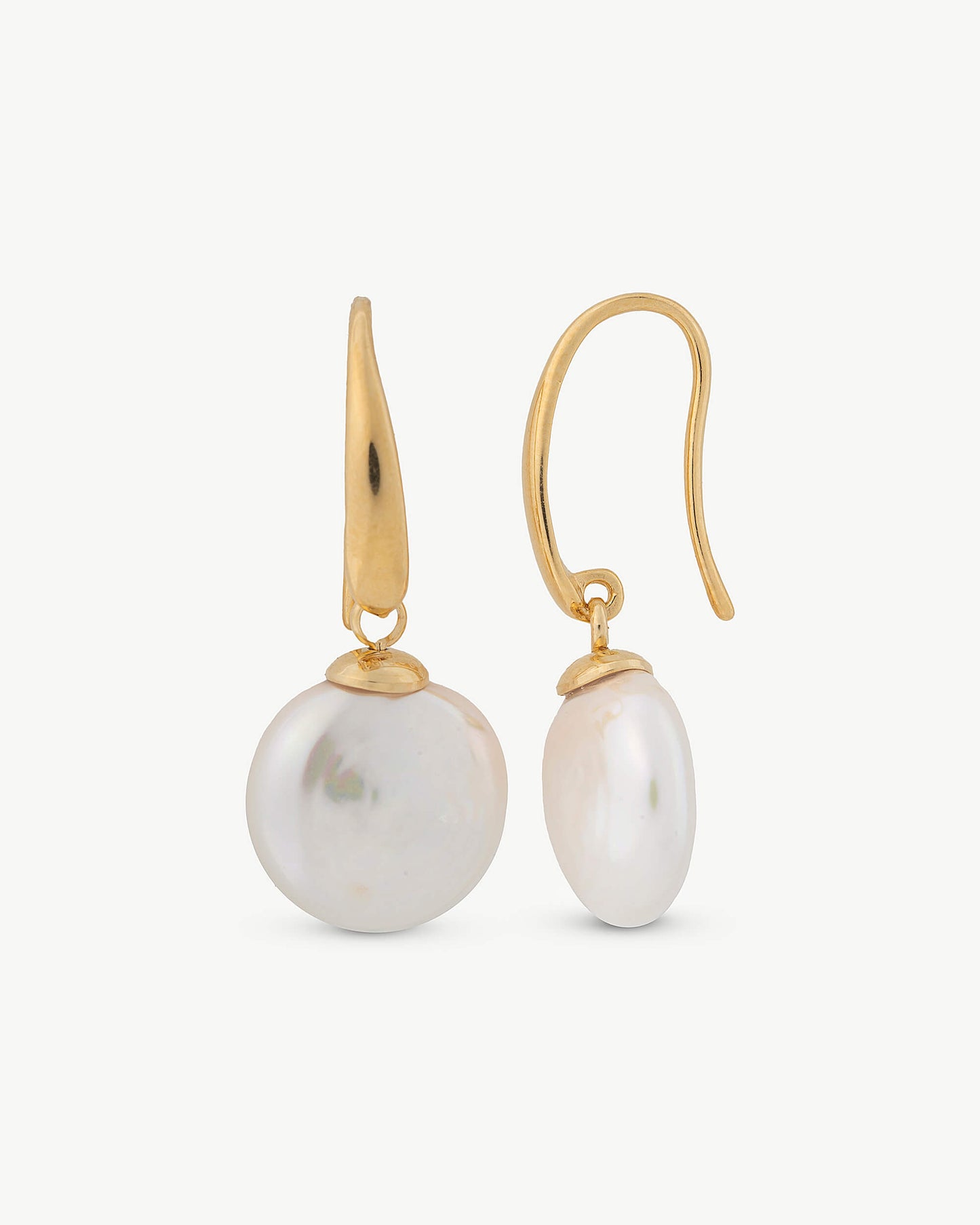 Pendientes cortos con cierre de gancho. Hechos en plata bañada en oro de 18k, con perlas en forma de pastilla oval blancas de 12mm.