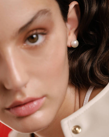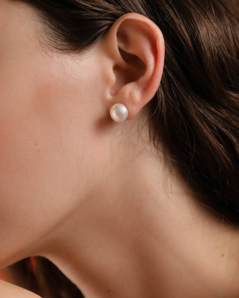 Pendientes de bolita con cierre de pincho en plata bañada en oro de 18k, con perla chata de 10mm blanca. Su diseño aporta aire fresco y versátil, permitiendo expresar tu estilo personal para cualquier ocasión.