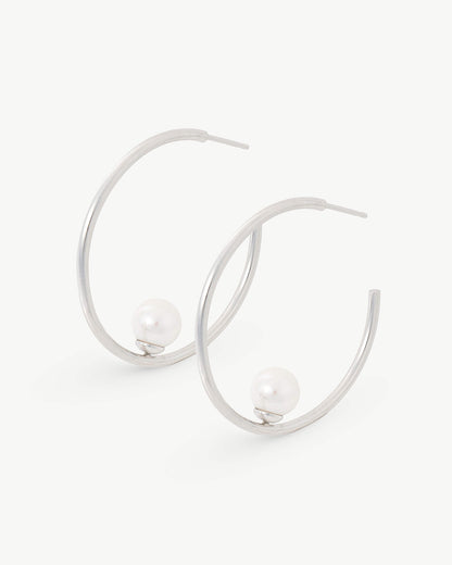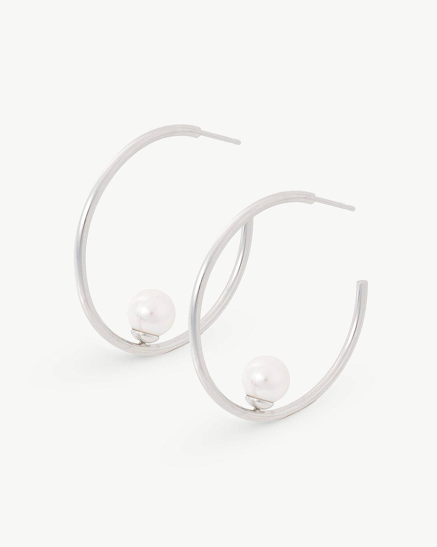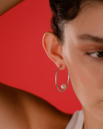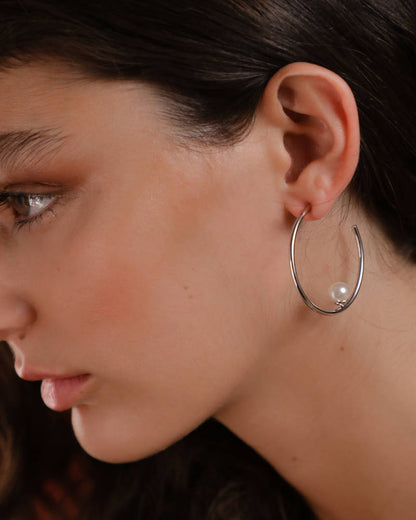 Pendientes de aro de 4cm ø con cierre de pincho en plata y perla redonda blanca de 8mm.