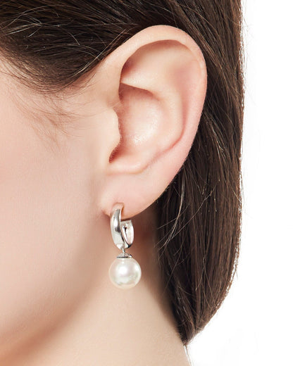Pendientes cortos de aro con cierre de pincho en plata y perla redonda blanca de 10mm.
