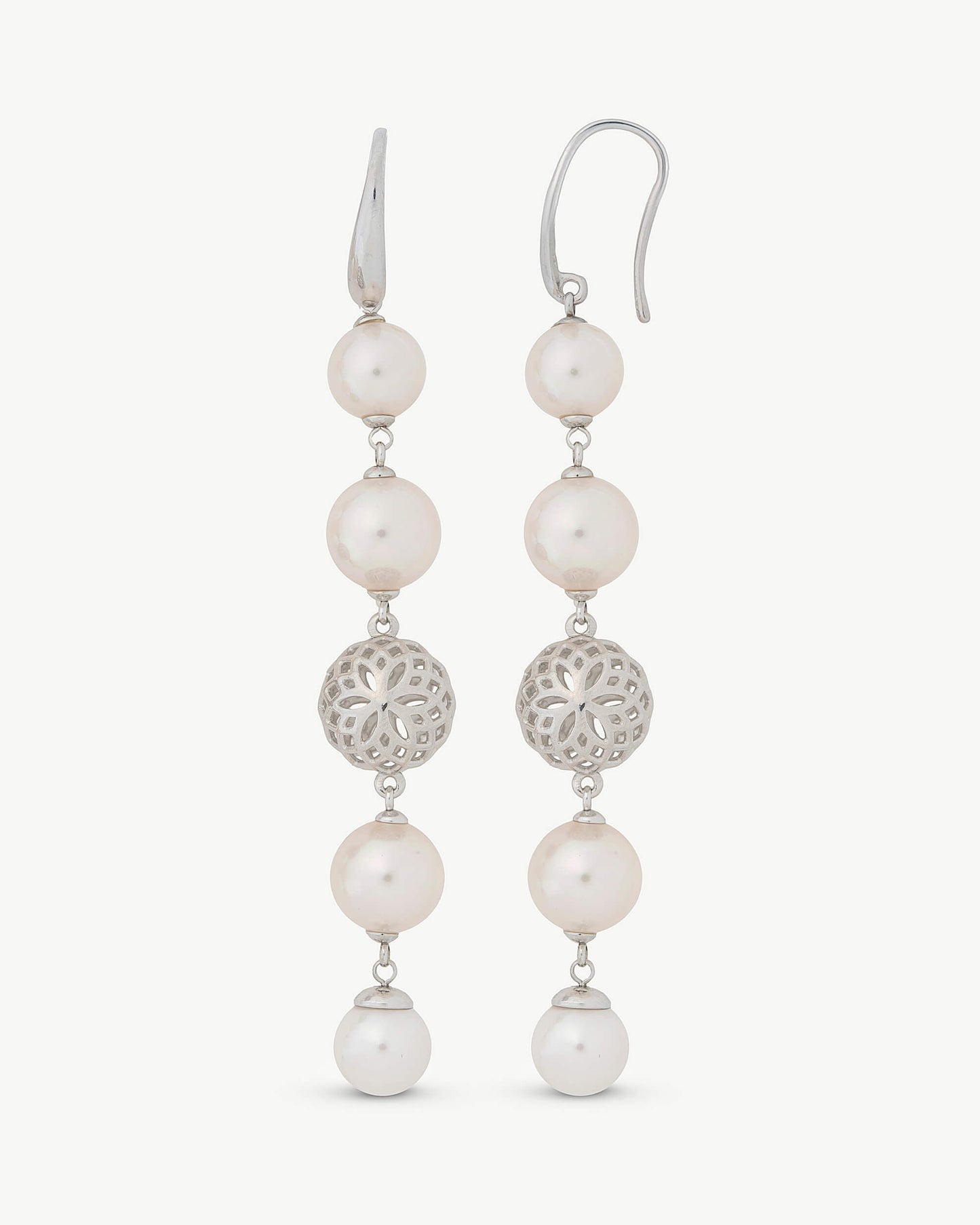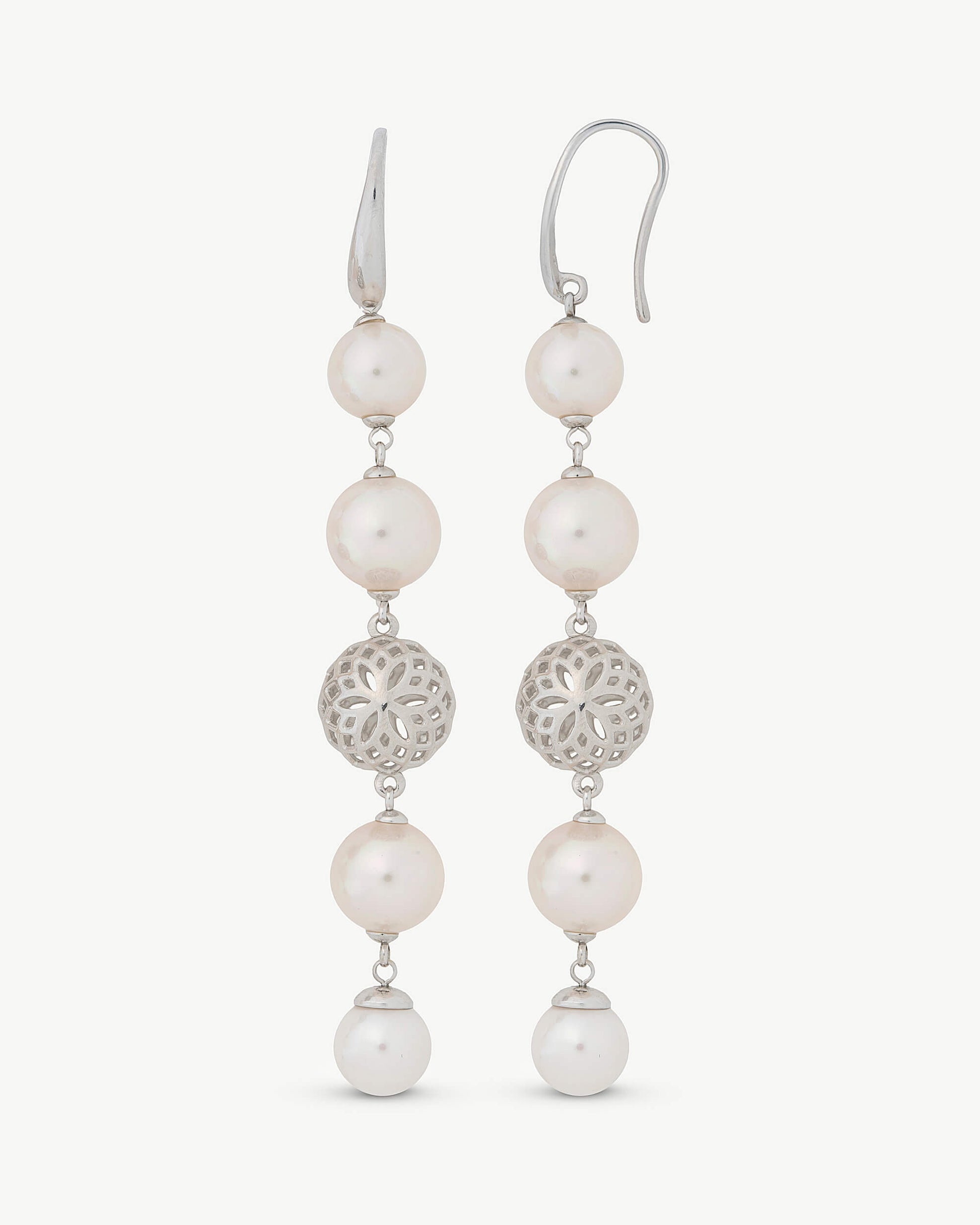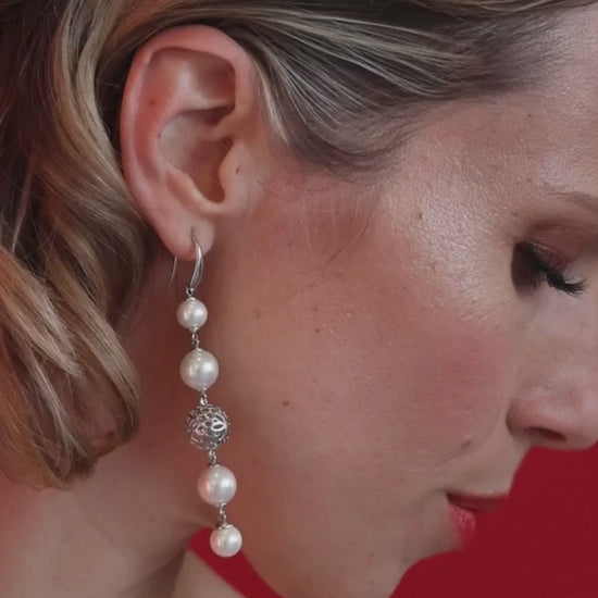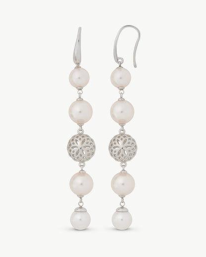 Pendientes largos en plata con perlas redondas blancas de 8 y 10mm y bola calada de plata y cierre de gancho. Largo de 8,3cm.