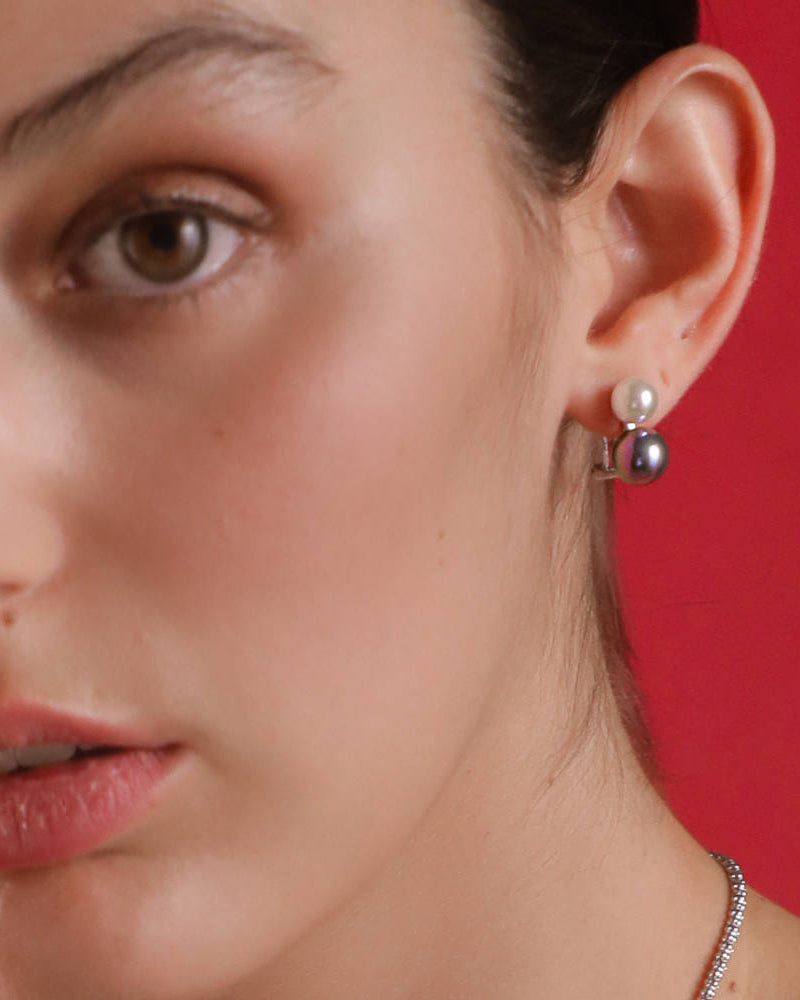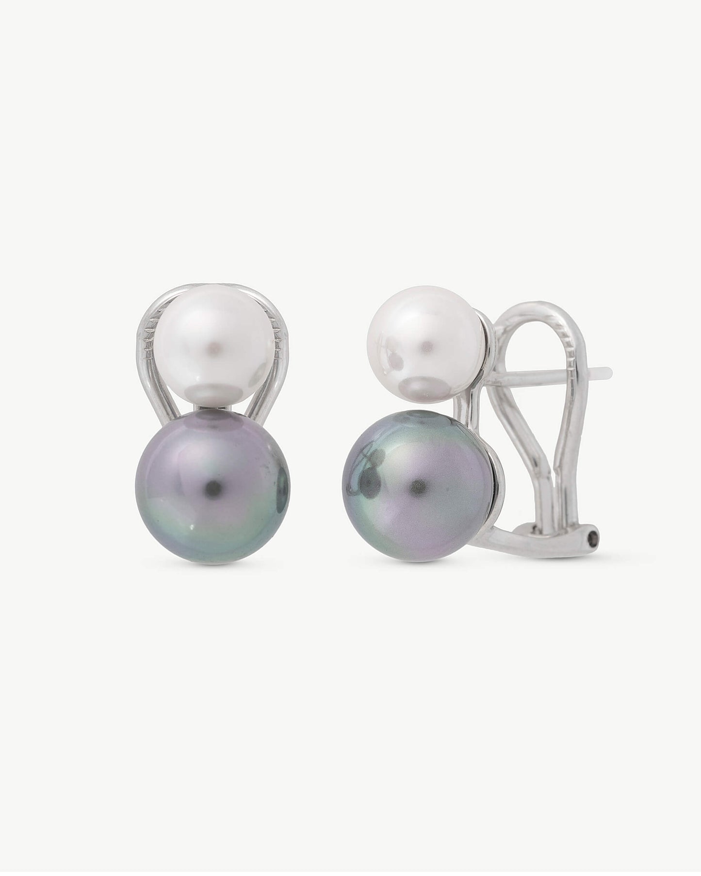 Pendientes cortos en plata con cierre omega y perlas de 7 y 9 mm en color blanco y gris.