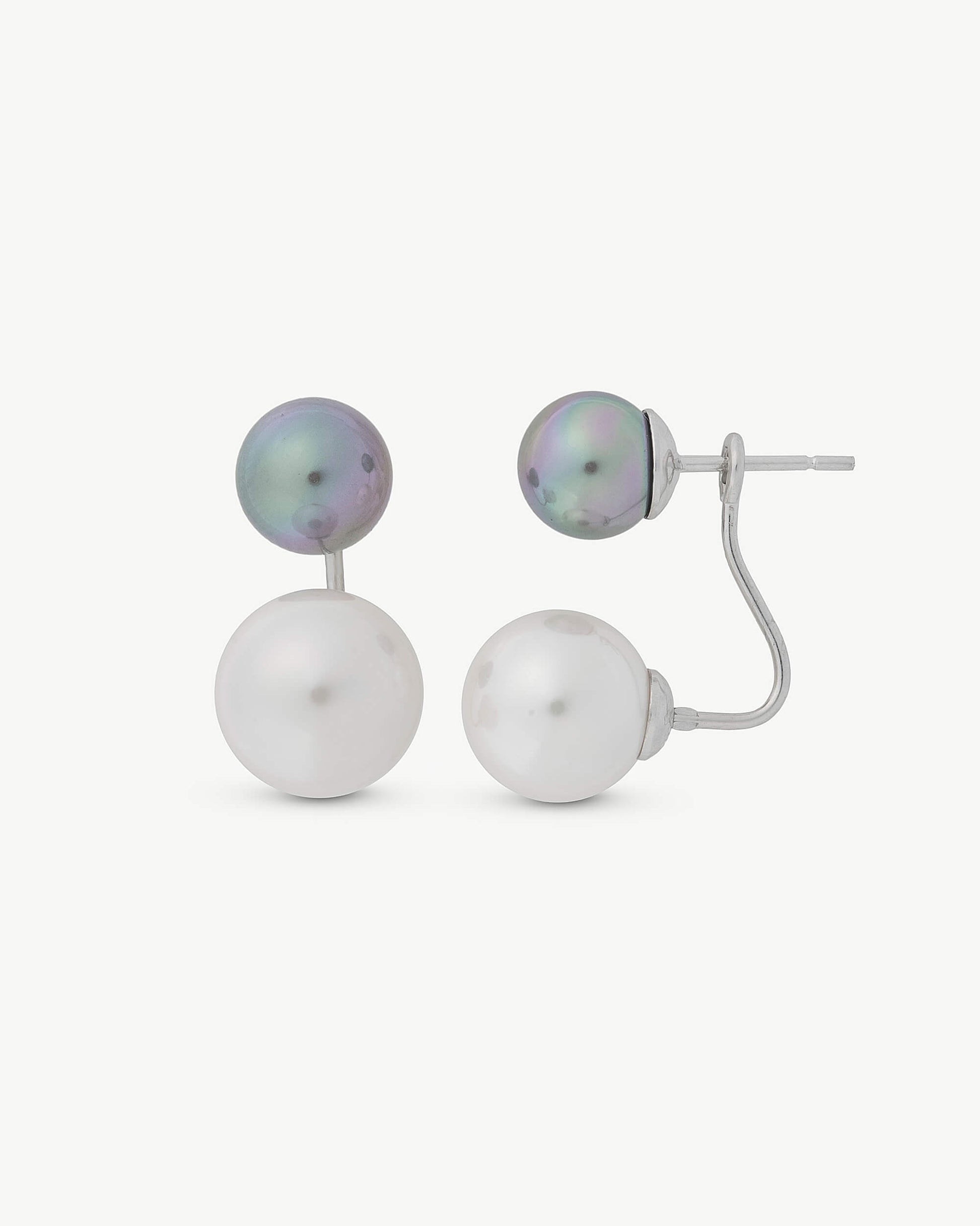 Pendientes cortos con cierre de pincho en plata y perlas redondas de 8 y 10mm en color blanco y gris.