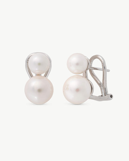 Pendientes cortos en plata con cierre omega y perlas de 7 y 9 mm en color blancas.