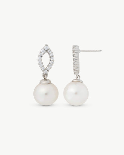 Pendientes cortos con cierre de pincho en plata y perlas redondas blancas de 11mm con circonitas.
