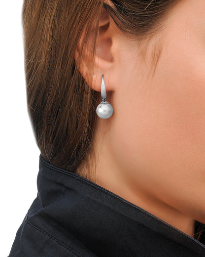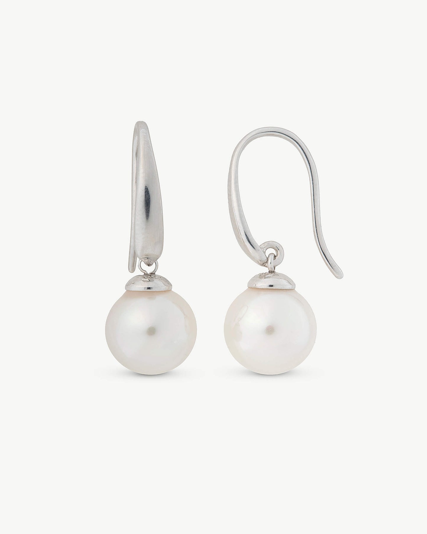 Pendientes cortos con cierre de gancho. Hechos en plata, con perlas redondas blancas de 10mm.
