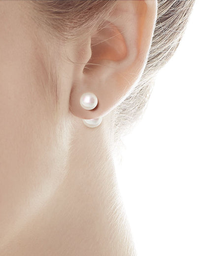 Pendientes dobles de bolita con pincho en plata con perlas redondas blancas de 8 y 12mm.