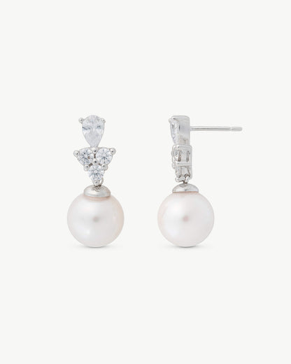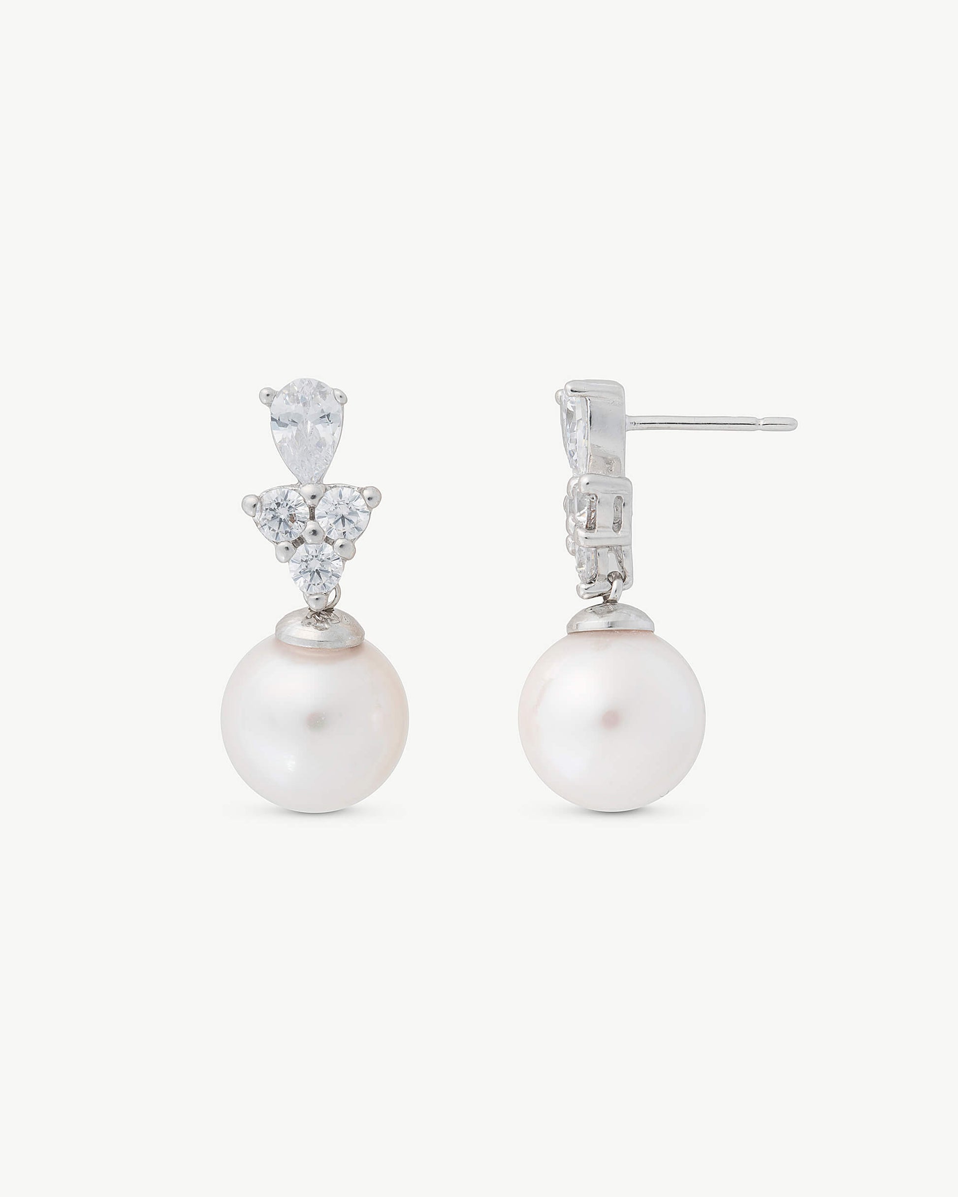 Pendientes cortos con cierre de pincho en plata con perla redonda blanca de 10mm y circonitas.