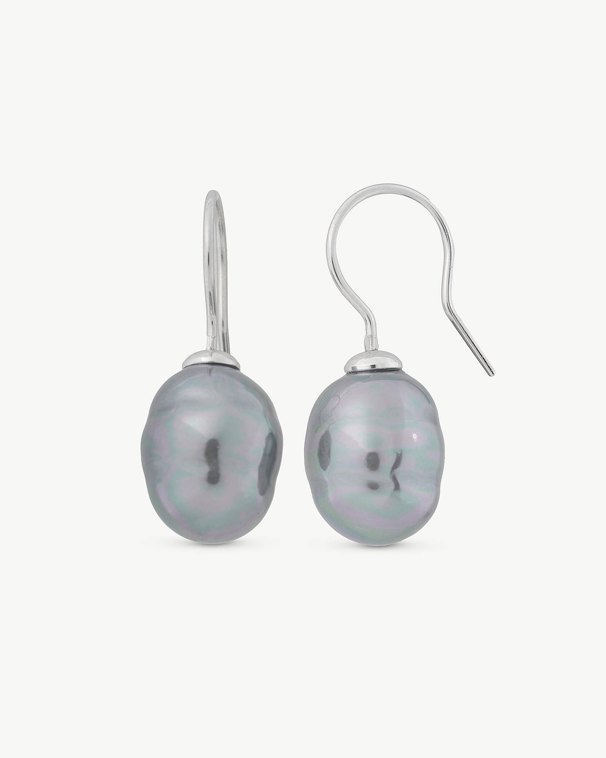 Pendientes cortos con cierre de gancho en plata y perla barroca gris de 12mm.