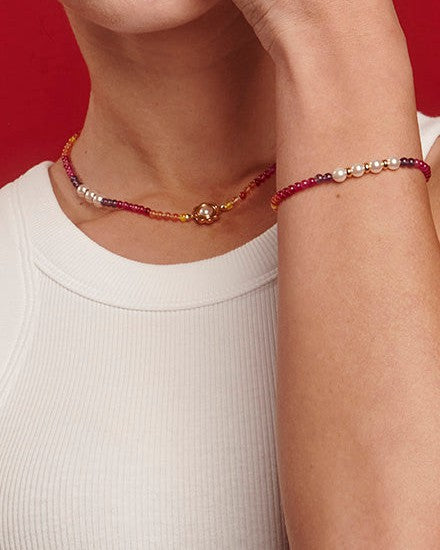 Brazalete/tobillera en plata con baño en oro y piedras en degrade de colores atardecer. Perlas redondas blancas de 6mm. 17cm de largo . Energía y diversión de los años 2.000 Si lo tuyo son las joyas coloridas, apuesta todo a la nueva colección Color Pop: joyas iconic que nacen de la paleta de colores tan representativa en los Y2K, hoy incluso elevada a un nivel superior.