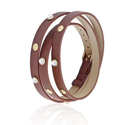 Brazalete o pulsera en cuero marrón, con remates en acero dorado y pelas blancas de 4mm.