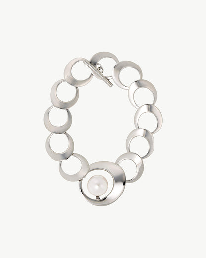 Brazalete encadenado de 20cm en acero, perla redonda blanca de 12mm. Petra es el nombre de nuestra colección y de la localidad que ocupa la parte más central de Mallorca, en el más puro corazón de la isla.