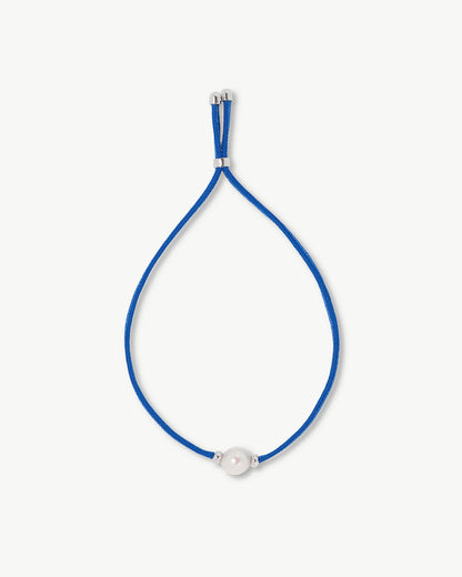 Brazalete elástico de 20 cm ajustable en color azul, perla redonda blanca de 8 mm.. La colección Sifnos es un tributo a la fuerza y empoderamiento.