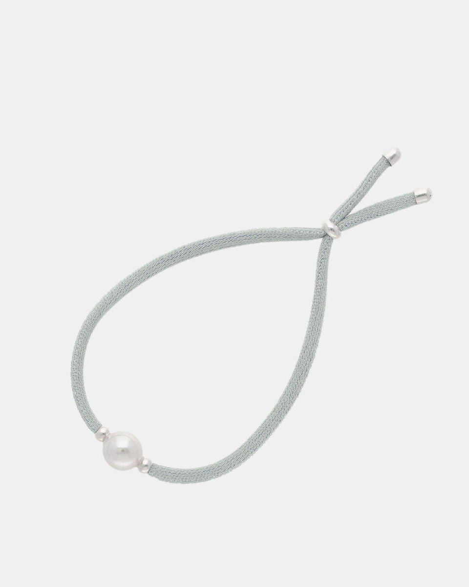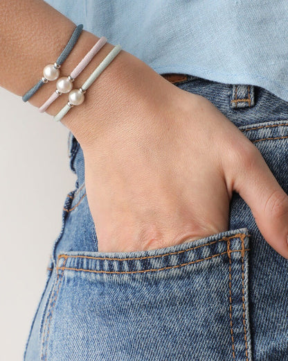 Brazalete elástico de 20 cm ajustable en color turquesa, perla redonda blanca de 8 mm.. La colección Sifnos es un tributo a la fuerza y empoderamiento.
