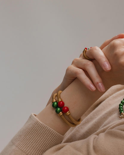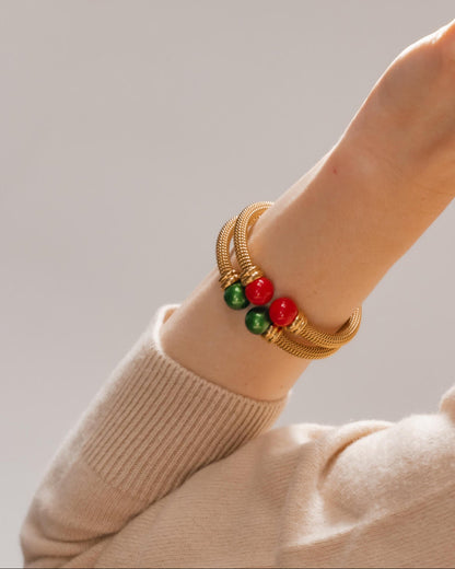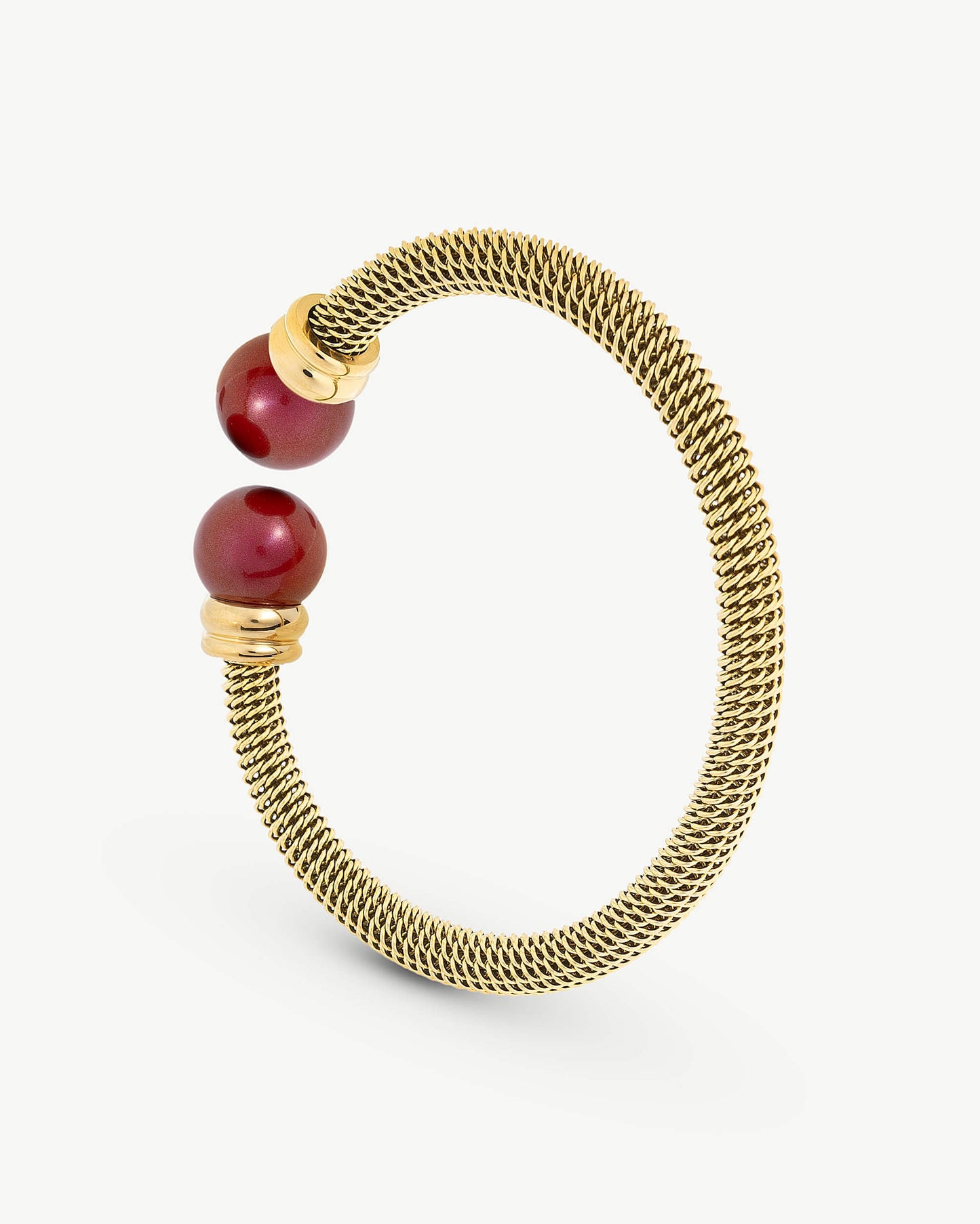Brazalete rígido en acero dorado, 12mm perlas redondas rojas. Para esta colección de brazaletes, anillos y pendientes, elaborados en acero de alta calidad y adornados con perlas, cada pieza ha sido creada para combinar la sobriedad del acero con la atemporalidad de las perlas.